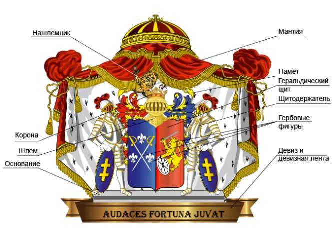 Специалисты также разделяют герб на составные части, выделяя следующие элементы: