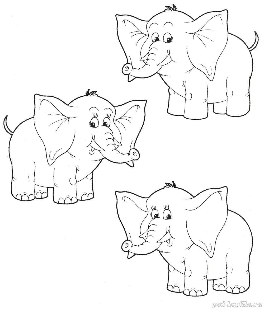 Дорисуй слонят так, чтобы они стали одинаковыми, и раскрась картинку.