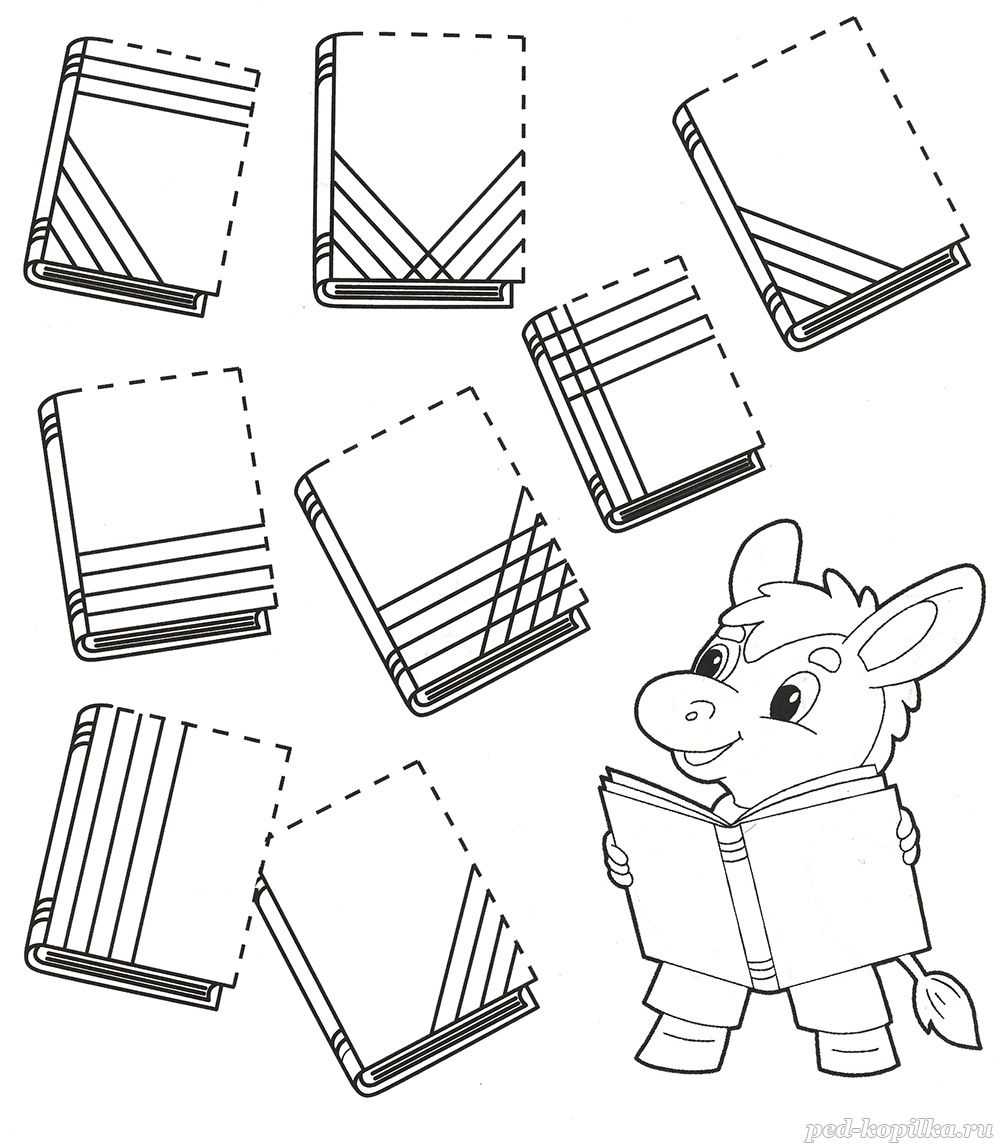 Обведи пунктирные линии, заштрихуй книжки по образцу и раскрась картинку.