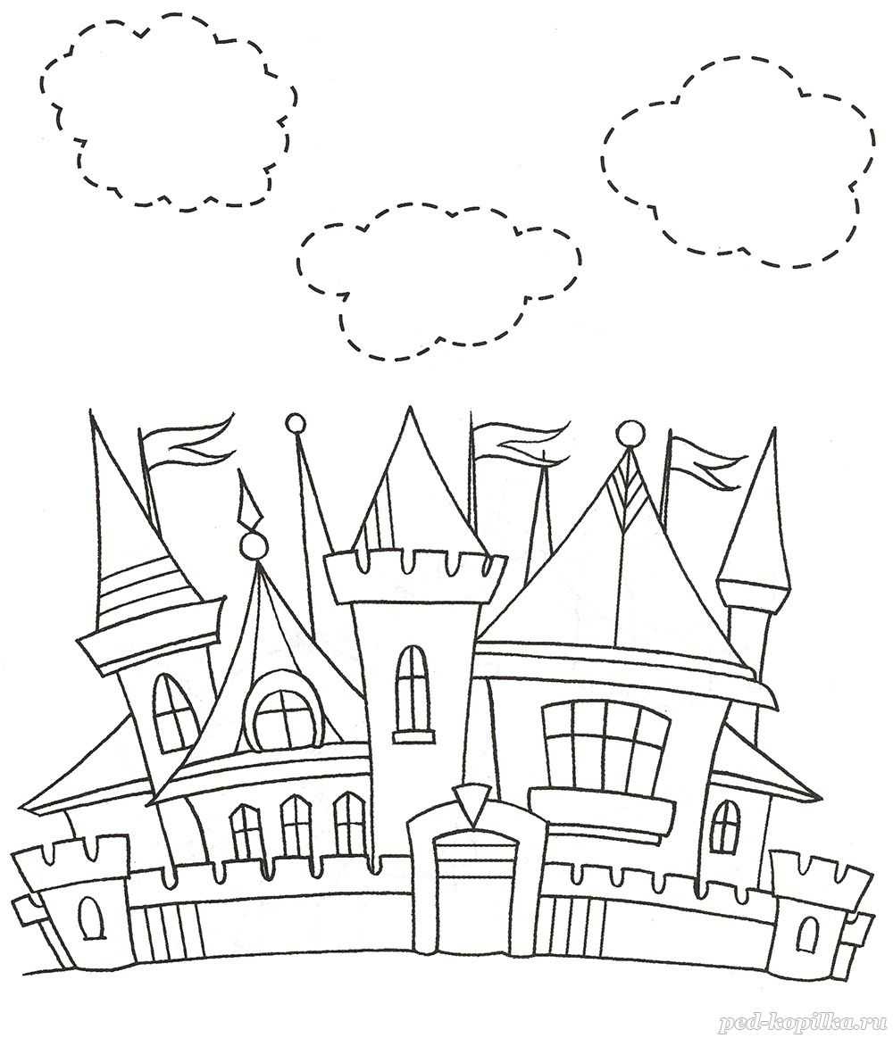 Обведи облака, заштрихуй детали замка по образцу и раскрась картинку.