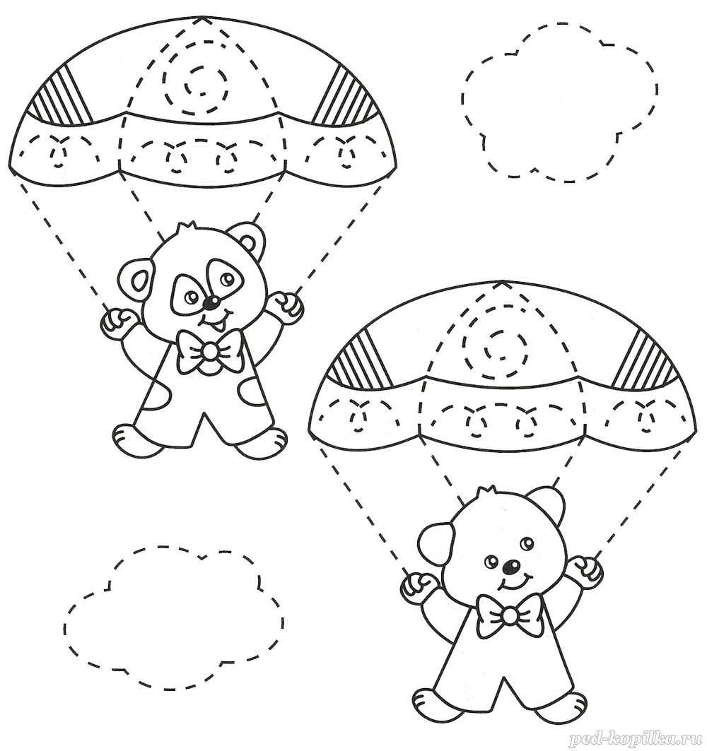 Обведи пунктирные линии и заштрихуй парашюты по образцу.