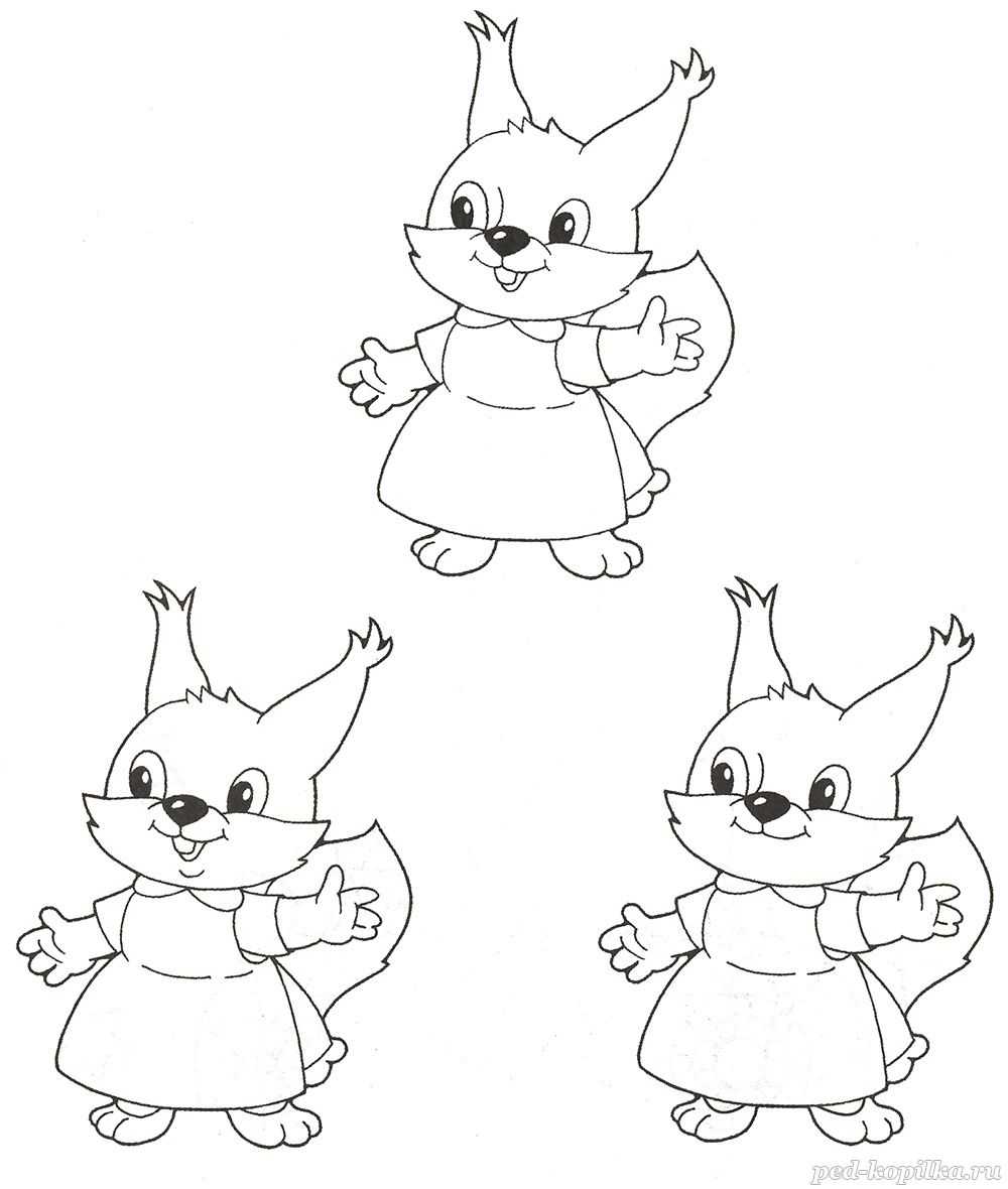Дорисуй белочек так, чтобы они стали одинаковыми, и раскрась картинку.