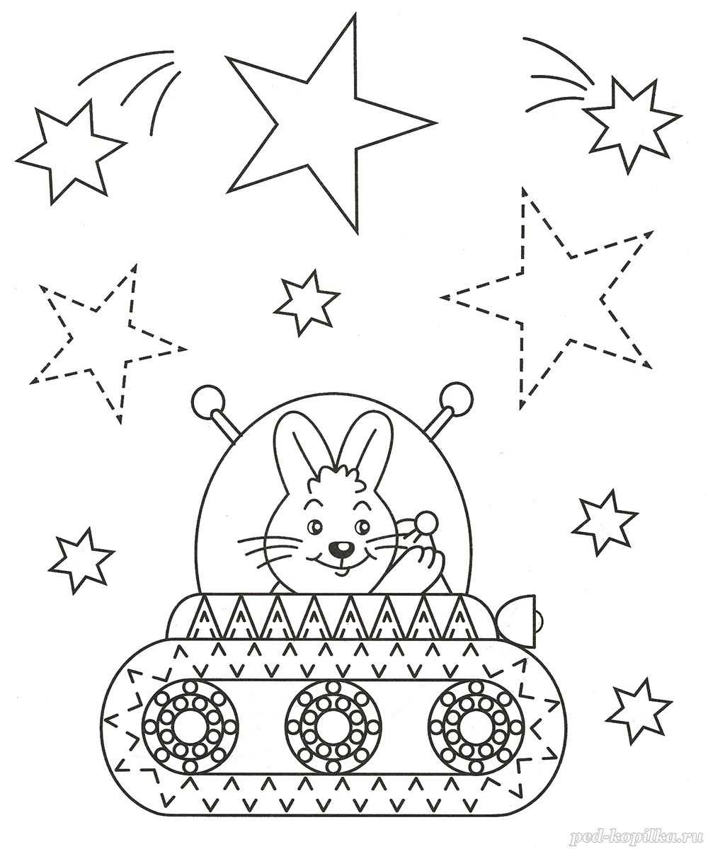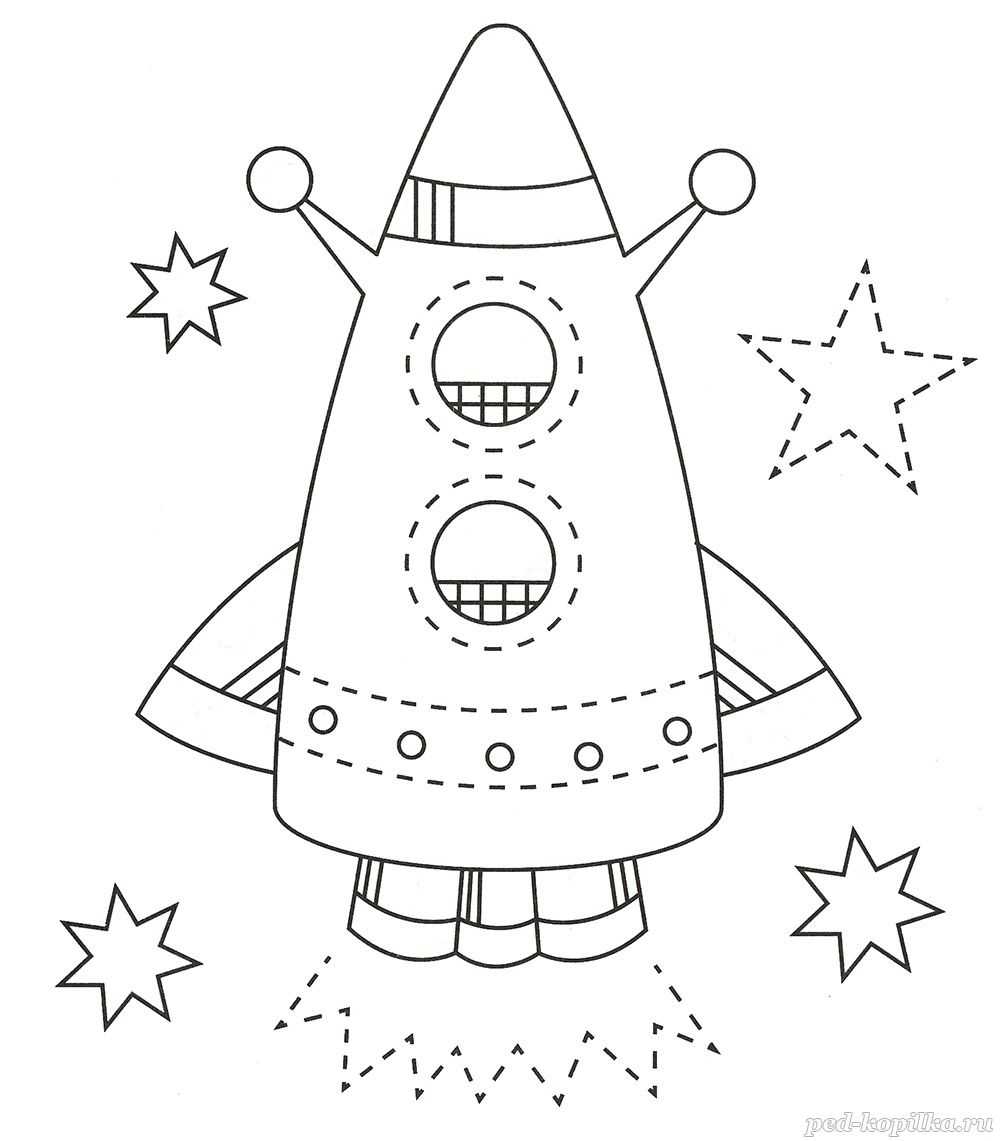 Обведи пунктирные линии, заштрихуй детали ракеты по образцу и раскрась картинку.