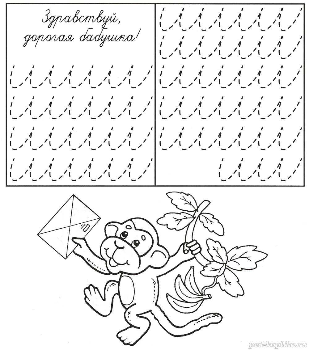 Помоги мартышке «написать» письмо бабушке: обведи пунктирные линии.