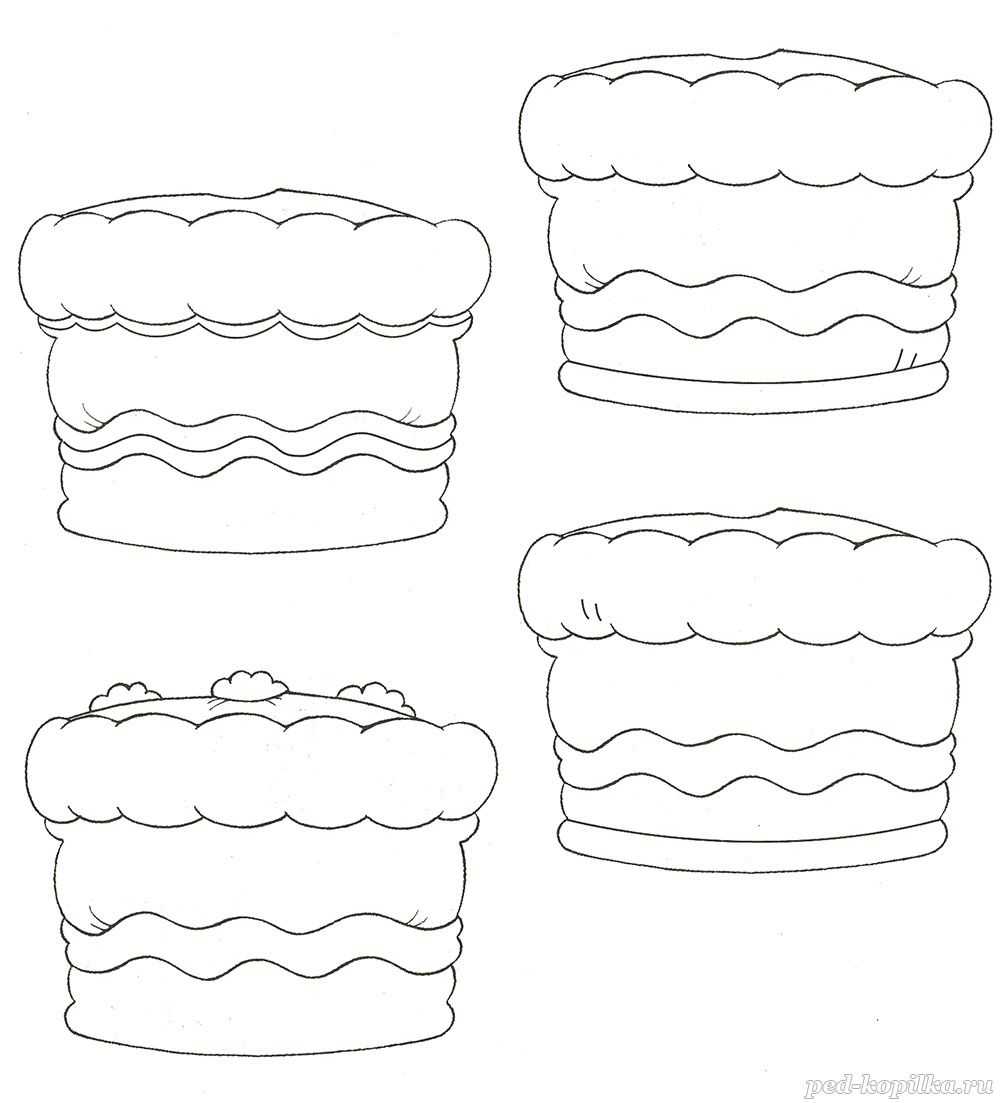 Дорисуй тортики так, чтобы они стали одинаковыми, раскрась картинку.