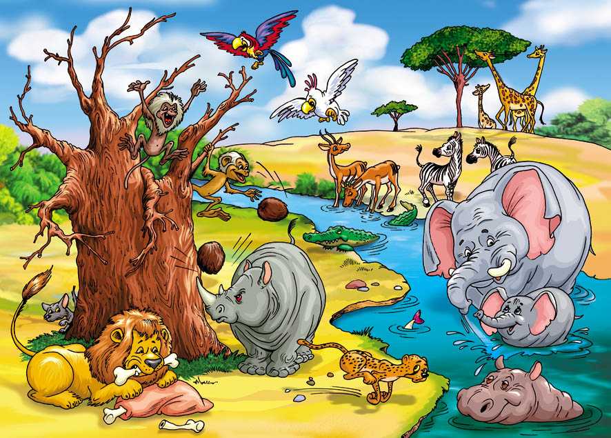 Ворона знакомит малыша с животными, обитающими в Африке. Перед занятием приготовьте большую карточку-картинку с изображением саванны. По мере прочтения просите малыша показать героя, о котором идет речь, на картинке или сами показывайте его. Для большей образности можно приготовить для этого занятия какой-нибудь экзотический фрукт, например, банан.